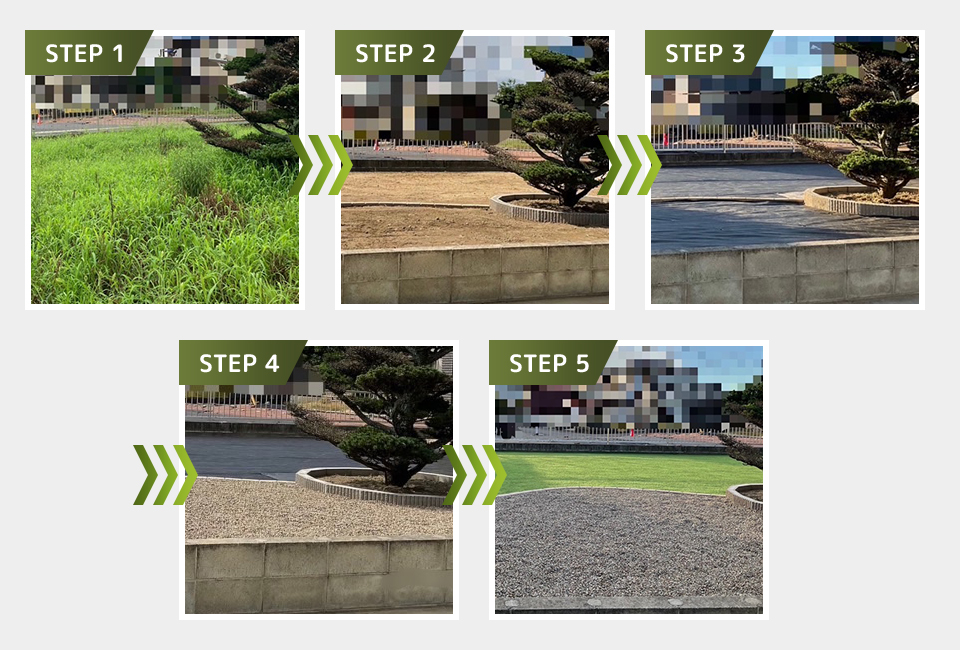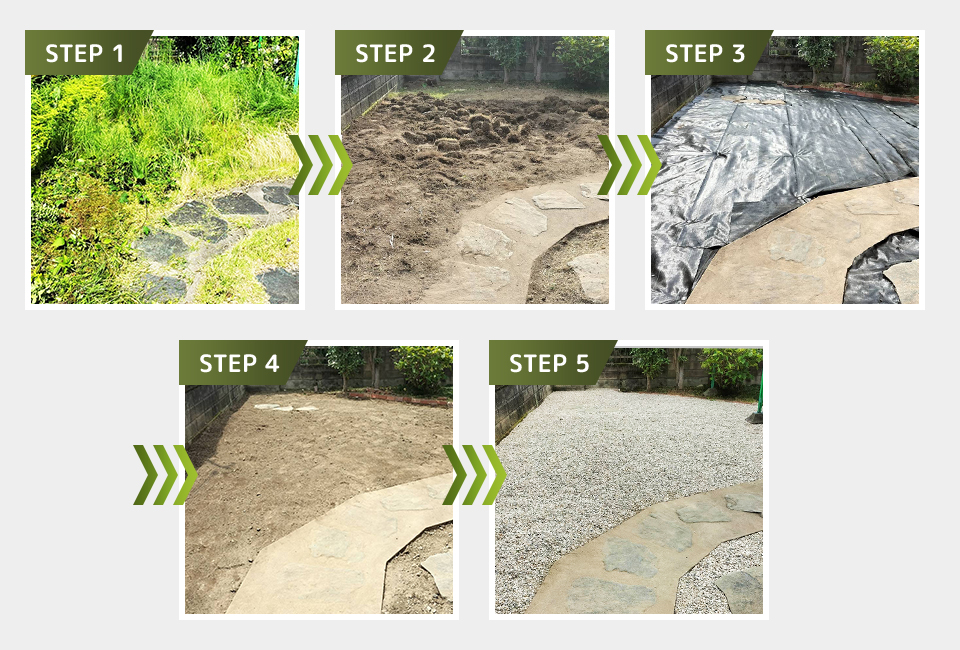 草刈り後に、しっかり根取り、そしてならし転圧後に防草シートを敷き、砂利巻いて施工します。